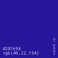 Цвет #28169A в цветовой модели RGB обозначается тремя октетами (40, 22, 154) в десятичном формате и #28169A в шестнадцатиричном (hex) формате, которые являются интенсивностью красного 40 (hex 28), интенсивность зелёного 22 (hex 16) и интенсивность синего 154 (hex 9A).