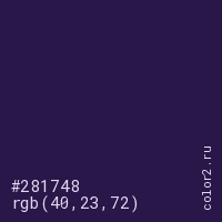 Цвет #281748 в цветовой модели RGB обозначается тремя октетами (40, 23, 72) в десятичном формате и #281748 в шестнадцатиричном (hex) формате, которые являются интенсивностью красного 40 (hex 28), интенсивность зелёного 23 (hex 17) и интенсивность синего 72 (hex 48).