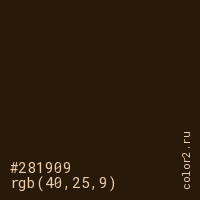 Цвет #281909 в цветовой модели RGB обозначается тремя октетами (40, 25, 9) в десятичном формате и #281909 в шестнадцатиричном (hex) формате, которые являются интенсивностью красного 40 (hex 28), интенсивность зелёного 25 (hex 19) и интенсивность синего 9 (hex 09).