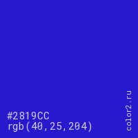 Цвет #2819CC в цветовой модели RGB обозначается тремя октетами (40, 25, 204) в десятичном формате и #2819CC в шестнадцатиричном (hex) формате, которые являются интенсивностью красного 40 (hex 28), интенсивность зелёного 25 (hex 19) и интенсивность синего 204 (hex CC).