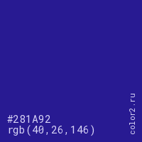 Цвет #281A92 в цветовой модели RGB обозначается тремя октетами (40, 26, 146) в десятичном формате и #281A92 в шестнадцатиричном (hex) формате, которые являются интенсивностью красного 40 (hex 28), интенсивность зелёного 26 (hex 1A) и интенсивность синего 146 (hex 92).