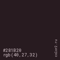 Цвет #281B20 в цветовой модели RGB обозначается тремя октетами (40, 27, 32) в десятичном формате и #281B20 в шестнадцатиричном (hex) формате, которые являются интенсивностью красного 40 (hex 28), интенсивность зелёного 27 (hex 1B) и интенсивность синего 32 (hex 20).