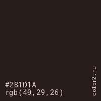 Цвет #281D1A в цветовой модели RGB обозначается тремя октетами (40, 29, 26) в десятичном формате и #281D1A в шестнадцатиричном (hex) формате, которые являются интенсивностью красного 40 (hex 28), интенсивность зелёного 29 (hex 1D) и интенсивность синего 26 (hex 1A).