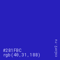 Цвет #281FBC в цветовой модели RGB обозначается тремя октетами (40, 31, 188) в десятичном формате и #281FBC в шестнадцатиричном (hex) формате, которые являются интенсивностью красного 40 (hex 28), интенсивность зелёного 31 (hex 1F) и интенсивность синего 188 (hex BC).