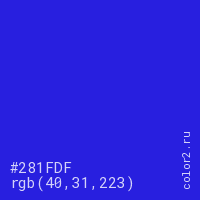 Цвет #281FDF в цветовой модели RGB обозначается тремя октетами (40, 31, 223) в десятичном формате и #281FDF в шестнадцатиричном (hex) формате, которые являются интенсивностью красного 40 (hex 28), интенсивность зелёного 31 (hex 1F) и интенсивность синего 223 (hex DF).