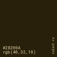 Цвет #28200A в цветовой модели RGB обозначается тремя октетами (40, 32, 10) в десятичном формате и #28200A в шестнадцатиричном (hex) формате, которые являются интенсивностью красного 40 (hex 28), интенсивность зелёного 32 (hex 20) и интенсивность синего 10 (hex 0A).