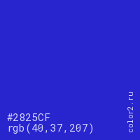 Цвет #2825CF в цветовой модели RGB обозначается тремя октетами (40, 37, 207) в десятичном формате и #2825CF в шестнадцатиричном (hex) формате, которые являются интенсивностью красного 40 (hex 28), интенсивность зелёного 37 (hex 25) и интенсивность синего 207 (hex CF).