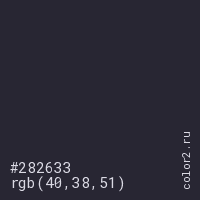 Цвет #282633 в цветовой модели RGB обозначается тремя октетами (40, 38, 51) в десятичном формате и #282633 в шестнадцатиричном (hex) формате, которые являются интенсивностью красного 40 (hex 28), интенсивность зелёного 38 (hex 26) и интенсивность синего 51 (hex 33).