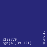 Цвет #282779 в цветовой модели RGB обозначается тремя октетами (40, 39, 121) в десятичном формате и #282779 в шестнадцатиричном (hex) формате, которые являются интенсивностью красного 40 (hex 28), интенсивность зелёного 39 (hex 27) и интенсивность синего 121 (hex 79).
