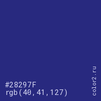 Цвет #28297F в цветовой модели RGB обозначается тремя октетами (40, 41, 127) в десятичном формате и #28297F в шестнадцатиричном (hex) формате, которые являются интенсивностью красного 40 (hex 28), интенсивность зелёного 41 (hex 29) и интенсивность синего 127 (hex 7F).