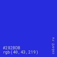 Цвет #282BDB в цветовой модели RGB обозначается тремя октетами (40, 43, 219) в десятичном формате и #282BDB в шестнадцатиричном (hex) формате, которые являются интенсивностью красного 40 (hex 28), интенсивность зелёного 43 (hex 2B) и интенсивность синего 219 (hex DB).