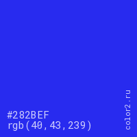 Цвет #282BEF в цветовой модели RGB обозначается тремя октетами (40, 43, 239) в десятичном формате и #282BEF в шестнадцатиричном (hex) формате, которые являются интенсивностью красного 40 (hex 28), интенсивность зелёного 43 (hex 2B) и интенсивность синего 239 (hex EF).