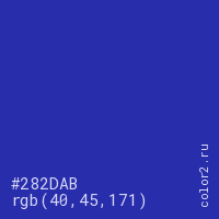 Цвет #282DAB в цветовой модели RGB обозначается тремя октетами (40, 45, 171) в десятичном формате и #282DAB в шестнадцатиричном (hex) формате, которые являются интенсивностью красного 40 (hex 28), интенсивность зелёного 45 (hex 2D) и интенсивность синего 171 (hex AB).