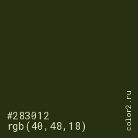 Цвет #283012 в цветовой модели RGB обозначается тремя октетами (40, 48, 18) в десятичном формате и #283012 в шестнадцатиричном (hex) формате, которые являются интенсивностью красного 40 (hex 28), интенсивность зелёного 48 (hex 30) и интенсивность синего 18 (hex 12).