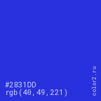 Цвет #2831DD в цветовой модели RGB обозначается тремя октетами (40, 49, 221) в десятичном формате и #2831DD в шестнадцатиричном (hex) формате, которые являются интенсивностью красного 40 (hex 28), интенсивность зелёного 49 (hex 31) и интенсивность синего 221 (hex DD).