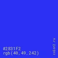 Цвет #2831F2 в цветовой модели RGB обозначается тремя октетами (40, 49, 242) в десятичном формате и #2831F2 в шестнадцатиричном (hex) формате, которые являются интенсивностью красного 40 (hex 28), интенсивность зелёного 49 (hex 31) и интенсивность синего 242 (hex F2).