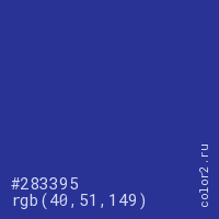 Цвет #283395 в цветовой модели RGB обозначается тремя октетами (40, 51, 149) в десятичном формате и #283395 в шестнадцатиричном (hex) формате, которые являются интенсивностью красного 40 (hex 28), интенсивность зелёного 51 (hex 33) и интенсивность синего 149 (hex 95).