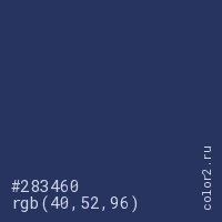 Цвет #283460 в цветовой модели RGB обозначается тремя октетами (40, 52, 96) в десятичном формате и #283460 в шестнадцатиричном (hex) формате, которые являются интенсивностью красного 40 (hex 28), интенсивность зелёного 52 (hex 34) и интенсивность синего 96 (hex 60).