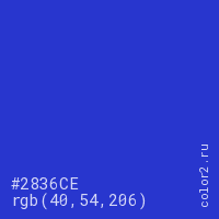 Цвет #2836CE в цветовой модели RGB обозначается тремя октетами (40, 54, 206) в десятичном формате и #2836CE в шестнадцатиричном (hex) формате, которые являются интенсивностью красного 40 (hex 28), интенсивность зелёного 54 (hex 36) и интенсивность синего 206 (hex CE).
