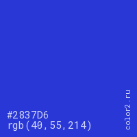 Цвет #2837D6 в цветовой модели RGB обозначается тремя октетами (40, 55, 214) в десятичном формате и #2837D6 в шестнадцатиричном (hex) формате, которые являются интенсивностью красного 40 (hex 28), интенсивность зелёного 55 (hex 37) и интенсивность синего 214 (hex D6).