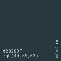 Цвет #28383F в цветовой модели RGB обозначается тремя октетами (40, 56, 63) в десятичном формате и #28383F в шестнадцатиричном (hex) формате, которые являются интенсивностью красного 40 (hex 28), интенсивность зелёного 56 (hex 38) и интенсивность синего 63 (hex 3F).