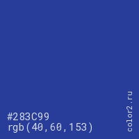 Цвет #283C99 в цветовой модели RGB обозначается тремя октетами (40, 60, 153) в десятичном формате и #283C99 в шестнадцатиричном (hex) формате, которые являются интенсивностью красного 40 (hex 28), интенсивность зелёного 60 (hex 3C) и интенсивность синего 153 (hex 99).
