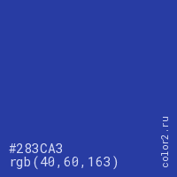 Цвет #283CA3 в цветовой модели RGB обозначается тремя октетами (40, 60, 163) в десятичном формате и #283CA3 в шестнадцатиричном (hex) формате, которые являются интенсивностью красного 40 (hex 28), интенсивность зелёного 60 (hex 3C) и интенсивность синего 163 (hex A3).