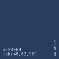 Цвет #283E60 в цветовой модели RGB обозначается тремя октетами (40, 62, 96) в десятичном формате и #283E60 в шестнадцатиричном (hex) формате, которые являются интенсивностью красного 40 (hex 28), интенсивность зелёного 62 (hex 3E) и интенсивность синего 96 (hex 60).