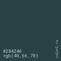 Цвет #284246 в цветовой модели RGB обозначается тремя октетами (40, 66, 70) в десятичном формате и #284246 в шестнадцатиричном (hex) формате, которые являются интенсивностью красного 40 (hex 28), интенсивность зелёного 66 (hex 42) и интенсивность синего 70 (hex 46).