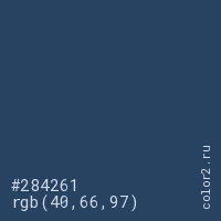 Цвет #284261 в цветовой модели RGB обозначается тремя октетами (40, 66, 97) в десятичном формате и #284261 в шестнадцатиричном (hex) формате, которые являются интенсивностью красного 40 (hex 28), интенсивность зелёного 66 (hex 42) и интенсивность синего 97 (hex 61).