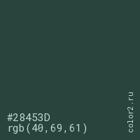 Цвет #28453D в цветовой модели RGB обозначается тремя октетами (40, 69, 61) в десятичном формате и #28453D в шестнадцатиричном (hex) формате, которые являются интенсивностью красного 40 (hex 28), интенсивность зелёного 69 (hex 45) и интенсивность синего 61 (hex 3D).
