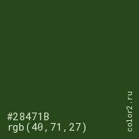Цвет #28471B в цветовой модели RGB обозначается тремя октетами (40, 71, 27) в десятичном формате и #28471B в шестнадцатиричном (hex) формате, которые являются интенсивностью красного 40 (hex 28), интенсивность зелёного 71 (hex 47) и интенсивность синего 27 (hex 1B).