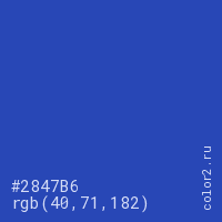 Цвет #2847B6 в цветовой модели RGB обозначается тремя октетами (40, 71, 182) в десятичном формате и #2847B6 в шестнадцатиричном (hex) формате, которые являются интенсивностью красного 40 (hex 28), интенсивность зелёного 71 (hex 47) и интенсивность синего 182 (hex B6).