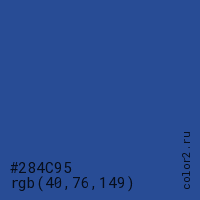 Цвет #284C95 в цветовой модели RGB обозначается тремя октетами (40, 76, 149) в десятичном формате и #284C95 в шестнадцатиричном (hex) формате, которые являются интенсивностью красного 40 (hex 28), интенсивность зелёного 76 (hex 4C) и интенсивность синего 149 (hex 95).