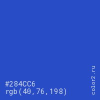Цвет #284CC6 в цветовой модели RGB обозначается тремя октетами (40, 76, 198) в десятичном формате и #284CC6 в шестнадцатиричном (hex) формате, которые являются интенсивностью красного 40 (hex 28), интенсивность зелёного 76 (hex 4C) и интенсивность синего 198 (hex C6).