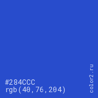 Цвет #284CCC в цветовой модели RGB обозначается тремя октетами (40, 76, 204) в десятичном формате и #284CCC в шестнадцатиричном (hex) формате, которые являются интенсивностью красного 40 (hex 28), интенсивность зелёного 76 (hex 4C) и интенсивность синего 204 (hex CC).