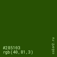 Цвет #285103 в цветовой модели RGB обозначается тремя октетами (40, 81, 3) в десятичном формате и #285103 в шестнадцатиричном (hex) формате, которые являются интенсивностью красного 40 (hex 28), интенсивность зелёного 81 (hex 51) и интенсивность синего 3 (hex 03).