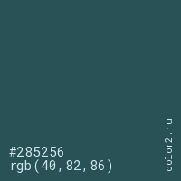 Цвет #285256 в цветовой модели RGB обозначается тремя октетами (40, 82, 86) в десятичном формате и #285256 в шестнадцатиричном (hex) формате, которые являются интенсивностью красного 40 (hex 28), интенсивность зелёного 82 (hex 52) и интенсивность синего 86 (hex 56).