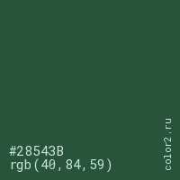 Цвет #28543B в цветовой модели RGB обозначается тремя октетами (40, 84, 59) в десятичном формате и #28543B в шестнадцатиричном (hex) формате, которые являются интенсивностью красного 40 (hex 28), интенсивность зелёного 84 (hex 54) и интенсивность синего 59 (hex 3B).