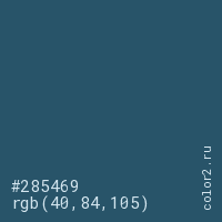 Цвет #285469 в цветовой модели RGB обозначается тремя октетами (40, 84, 105) в десятичном формате и #285469 в шестнадцатиричном (hex) формате, которые являются интенсивностью красного 40 (hex 28), интенсивность зелёного 84 (hex 54) и интенсивность синего 105 (hex 69).