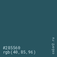 Цвет #285560 в цветовой модели RGB обозначается тремя октетами (40, 85, 96) в десятичном формате и #285560 в шестнадцатиричном (hex) формате, которые являются интенсивностью красного 40 (hex 28), интенсивность зелёного 85 (hex 55) и интенсивность синего 96 (hex 60).