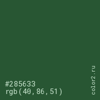 Цвет #285633 в цветовой модели RGB обозначается тремя октетами (40, 86, 51) в десятичном формате и #285633 в шестнадцатиричном (hex) формате, которые являются интенсивностью красного 40 (hex 28), интенсивность зелёного 86 (hex 56) и интенсивность синего 51 (hex 33).