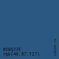 Цвет #28577F в цветовой модели RGB обозначается тремя октетами (40, 87, 127) в десятичном формате и #28577F в шестнадцатиричном (hex) формате, которые являются интенсивностью красного 40 (hex 28), интенсивность зелёного 87 (hex 57) и интенсивность синего 127 (hex 7F).