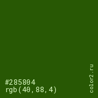 Цвет #285804 в цветовой модели RGB обозначается тремя октетами (40, 88, 4) в десятичном формате и #285804 в шестнадцатиричном (hex) формате, которые являются интенсивностью красного 40 (hex 28), интенсивность зелёного 88 (hex 58) и интенсивность синего 4 (hex 04).