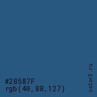 Цвет #28587F в цветовой модели RGB обозначается тремя октетами (40, 88, 127) в десятичном формате и #28587F в шестнадцатиричном (hex) формате, которые являются интенсивностью красного 40 (hex 28), интенсивность зелёного 88 (hex 58) и интенсивность синего 127 (hex 7F).
