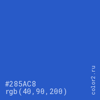 Цвет #285AC8 в цветовой модели RGB обозначается тремя октетами (40, 90, 200) в десятичном формате и #285AC8 в шестнадцатиричном (hex) формате, которые являются интенсивностью красного 40 (hex 28), интенсивность зелёного 90 (hex 5A) и интенсивность синего 200 (hex C8).