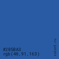 Цвет #285BA3 в цветовой модели RGB обозначается тремя октетами (40, 91, 163) в десятичном формате и #285BA3 в шестнадцатиричном (hex) формате, которые являются интенсивностью красного 40 (hex 28), интенсивность зелёного 91 (hex 5B) и интенсивность синего 163 (hex A3).
