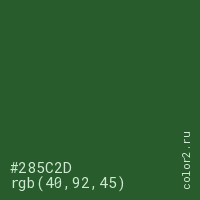 Цвет #285C2D в цветовой модели RGB обозначается тремя октетами (40, 92, 45) в десятичном формате и #285C2D в шестнадцатиричном (hex) формате, которые являются интенсивностью красного 40 (hex 28), интенсивность зелёного 92 (hex 5C) и интенсивность синего 45 (hex 2D).