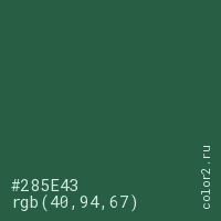 Цвет #285E43 в цветовой модели RGB обозначается тремя октетами (40, 94, 67) в десятичном формате и #285E43 в шестнадцатиричном (hex) формате, которые являются интенсивностью красного 40 (hex 28), интенсивность зелёного 94 (hex 5E) и интенсивность синего 67 (hex 43).