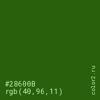 Цвет #28600B в цветовой модели RGB обозначается тремя октетами (40, 96, 11) в десятичном формате и #28600B в шестнадцатиричном (hex) формате, которые являются интенсивностью красного 40 (hex 28), интенсивность зелёного 96 (hex 60) и интенсивность синего 11 (hex 0B).